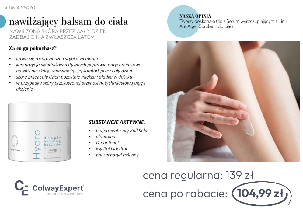 Odkryj sekret nawilżonej i miękkiej skóry dzięki naszemu nawilżającemu balsamowi do ciała Colway! Dzięki kompleksowi z alg morskich, Twoja skóra będzie intensywnie nawilżona, nawet jeśli jest skłonna do przesuszeń. Oleje z awokado, słodkich migdałów i oliwek regenerują skórę, a colostrum ujędrnia ją efektywnie. Mocznik pomaga utrzymać odpowiednie nawodnienie, poprawiając elastyczność i sprężystość, a witamina E neutralizuje wolne rodniki i opóźnia procesy starzenia. Wyciąg z aloesu natomiast przywraca gładkość i miękkość. Nasz Balsam nawilżający to komfort dla Twojej skóry przez cały dzień, zwłaszcza latem!