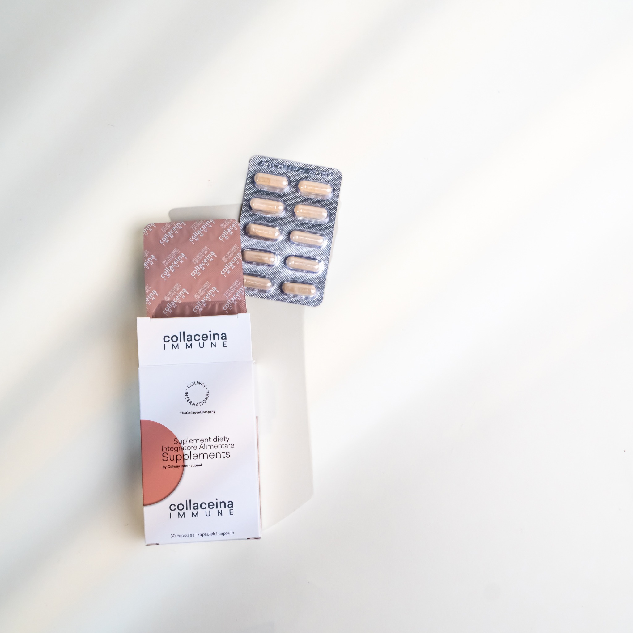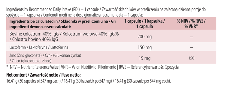 Collaceina Immune to połączenie wysokiej dawki kolostrum, laktoferyny i cynku.