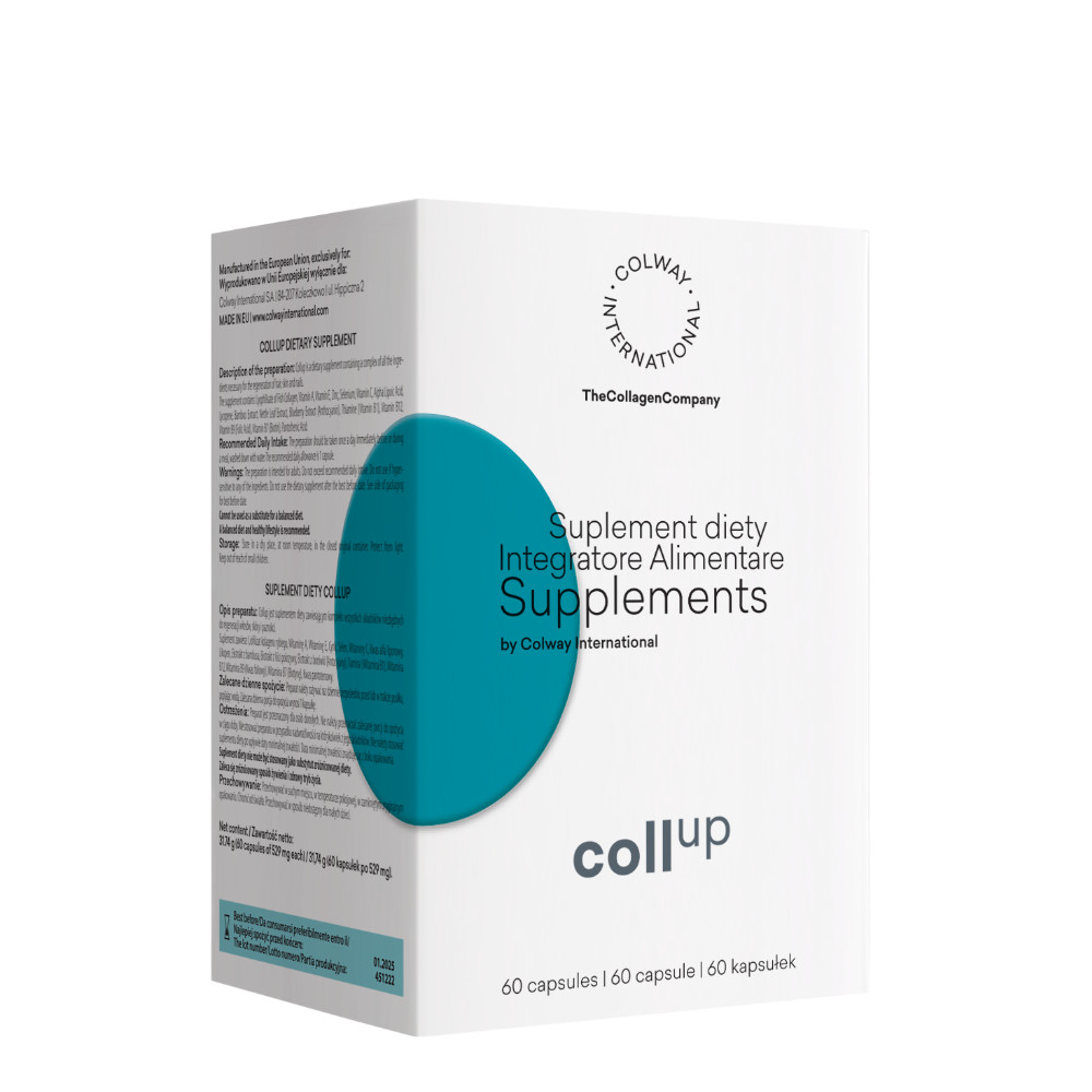 CollUp jest suplementem diety zawierającym kompleks wszystkich składników niezbędnych do regeneracji włosów, skóry i paznokci. Witaminy A oraz biotyna przyczyniają się do utrzymania prawidłowego stanu skóry i błon śluzowych. Kwas foliowy przyczynia się do prawidłowej syntezy homocysteiny i aminokwasów. Cynk i selen przyczyniają się do utrzymania prawidłowego stanu paznokci i włosów.